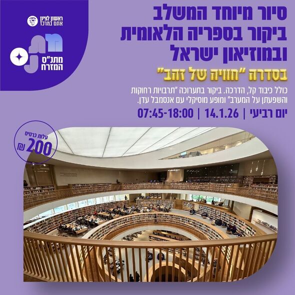 יום תרבות בירושלים: סיור במוזיאון ישראל ובספרייה הלאומית הכולל מופע מוזיקלי יתקיים ביום רביעי ה-14.1.26 וייצא מתנ"ס שיכוני המזרח ראשון לציון