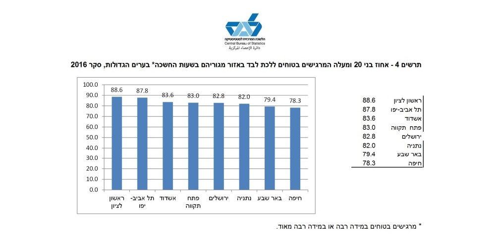 את הנתונים האלה יהיו כאלה שיאהבו ויהיו כאלה שלא. אך הנתונים שמפרסם בשעות האחרונות הלמ"ס משקפים סקר שנערך בקרב תושבי 8 הערים הגדולות בישראל המונות מעל 200 אלף תושבים. והסקר בקרב בני 20 ומעלה בחן את השאלה "כמה התושבים חשים בטוחים במידה רבה או במידה רבה מאוד ללכת לבד באזור המגורים בשעות החשכה" מניתוח הסקר התברר כי כ - 89% מתושבי ראשון דיווחו שהם חשים בטוחים במידה רבה או במידה רבה מאוד ללכת לבדם באזור המגורים בשעות החשכה. ואילו בחיפה תחושת הביטחון הייתה הנמוכה ביותר.