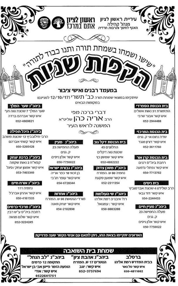 הזמנה להקפות שניות בבתי כנסת ברחבי העיר במוצאי החג ה(12.10.17)