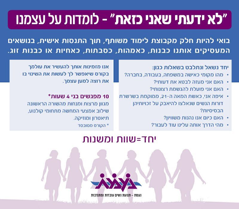 קורס של נעמ"ת "לא ידעתי שאני כזאת" בנושאי מגדר ופמניזם הקורס בעלות סימלית יפתח בתאריך ה 7.11.17 ימי שלישי בין השעות 17:00-20:15