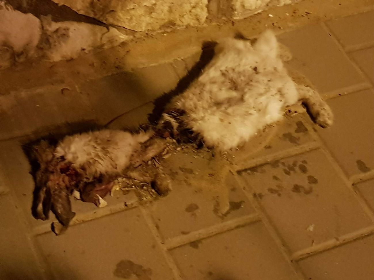 2 חתולים שכבו זה לצד זה אחד נראה בוגר יותר והשני צעיר יותר כשהם ערופי ראש.