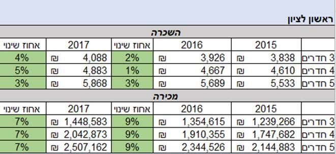 נתוני אתר יד2 מגלים כי בשנה האחרונה מחירי הדירות בראשון לציון ממשיכים לעלות. מהנתונים עולה, כי בתוך שנה עלו מחירי הדירות בעיר בכ- 7% בממוצע. כך למשל אם בתקופה המקבילה אשתקד מחיר דירת 4 חדרים עמד כ-1.91 מיליון שקל בממוצע, היום דירות 4 חדרים בראשון לציון נמכרות במחיר של 2.04 מיליון שקל בממוצע. עלייה בשיעור דומה נרשמה גם במחירי דירות 3 חדרים ודירות 5 חדרים בעיר. כיום מחיר דירת 3 חדרים בעיר עומד בממוצע על 1.44 מיליון שקל ומחיר דירת 5 חדרים על 2.5 מיליון שקל.
