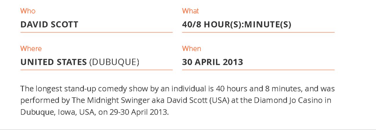 צילום מסך של אתר גינס על מופע הסטנאפ : על פי האתר מי שמחזיק בשיא הוא דויד סקוט