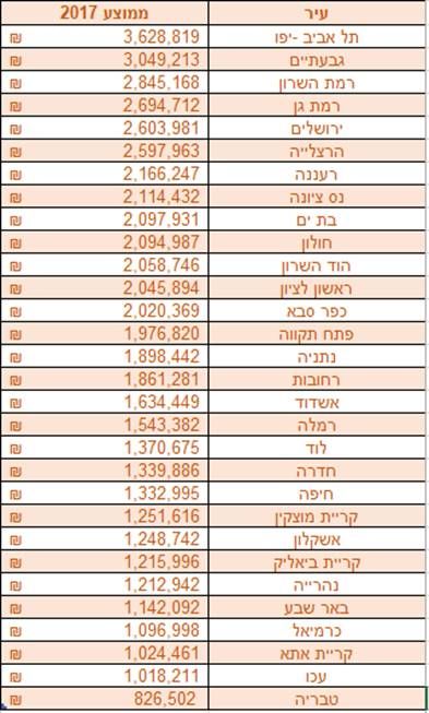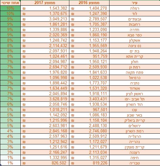 אתר יד 2 פרסם את סיכום מחירי הדירות לשנת 2017 בערי ישראל. הנתונים מתייחסים לדירות 4 חדרים.