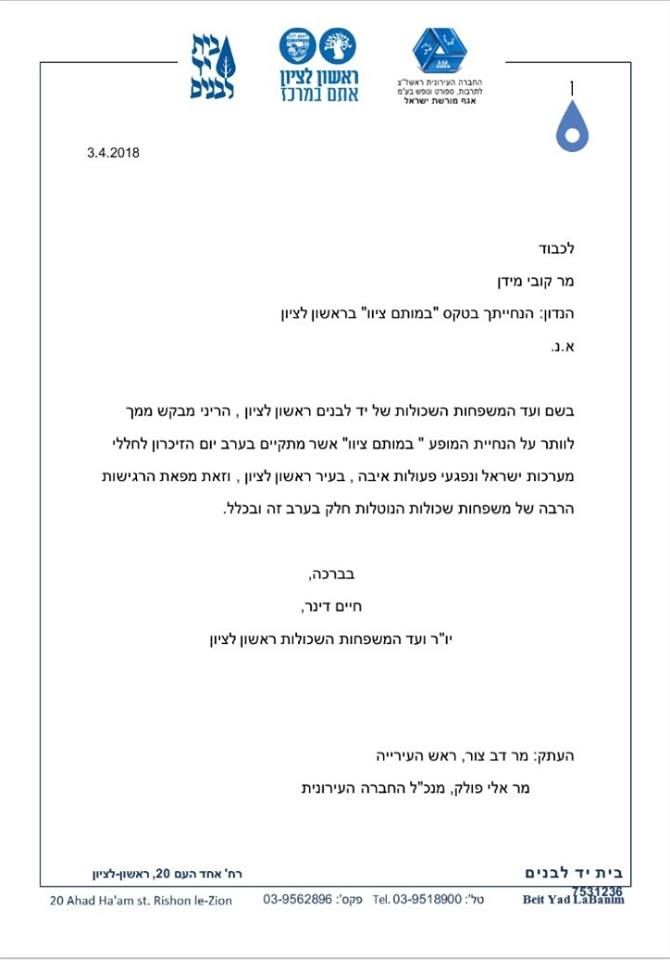 להלן מכתבו של חיים דינר יו״ר ועד המשפחות השכולות ראשון לציון: