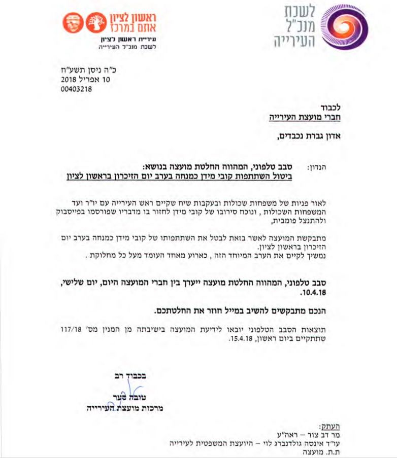 סערת קובי מידן מתקרבת לשיאה. הבוקר שלישי 10/4 לשכת ראש העיר הוציאה מכתב לכל חברי מועצת העיר ובקשה להשיב במייל את עמדתם לגבי ביטול/קיום הנחיית טקס ערב יום הזיכרון לחללי צה"ל.