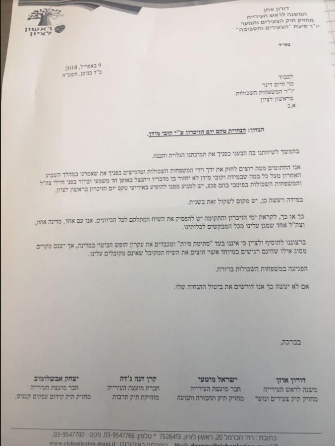 להלן מכתבם של חברי מועצת העיר דורון אוזן, ישראל מוטעי, קרן דנה ויצחק אבשלומוב ליו"ר המשפחות השכולות בראשון לציון חיים דינר. כמו כן יש לציין כי ישנם חברי מועצה נוספים אשר בקשו לקיים דיון במועצת העיר ולבטל את ההנחייה ובהם מאיר עקיבא ואסף דעבול