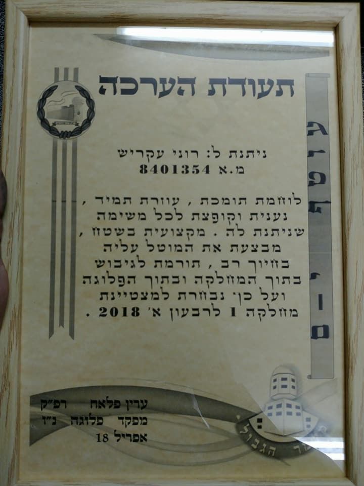 בתעודת ההצטיינות נכתב: "מבצעת את המוטל העליה בחיוך רב, תורמת לגיבוש בתוך המחלקה ובתוך החטיבה"