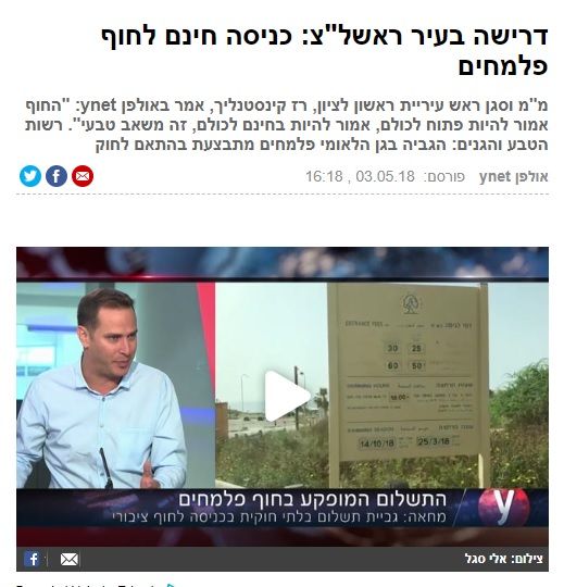 וכעת, רז קינסטליך מתראיין באולפן YNET מספר שמחיר החנייה בפלמחים 30 ₪ ולא אומר כי בימי חול זה 25 ₪ ולא מספר כי במהלך השנה (למעט עונת הרחצה) מחיר הכניסה רק 10 ₪ ו"מפריח סיסמאות" "החוף אמור להיות פתוח לכולם, אמור להיות בחינם לכולם, זה משאב טבעי "ולא מזכיר באף מילה כי בזמן שהוא דורש מחוף פלמחים "להיות בחינם לכולם" חוף ראשון לא בחינם לכולם, רק לתושבי ראשון!