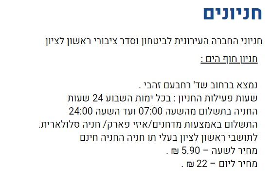 אורחאני וחברים שלי תושבי ראשון ולפני כחצי שנה בערך, באנו לחוף פלמחים ב8 בערב עד 2 בלילה ולקחו מאיתנו כמעט 60 שקל ואמרו זה נחשב יומיים...07.05.18 08:43 תגובה