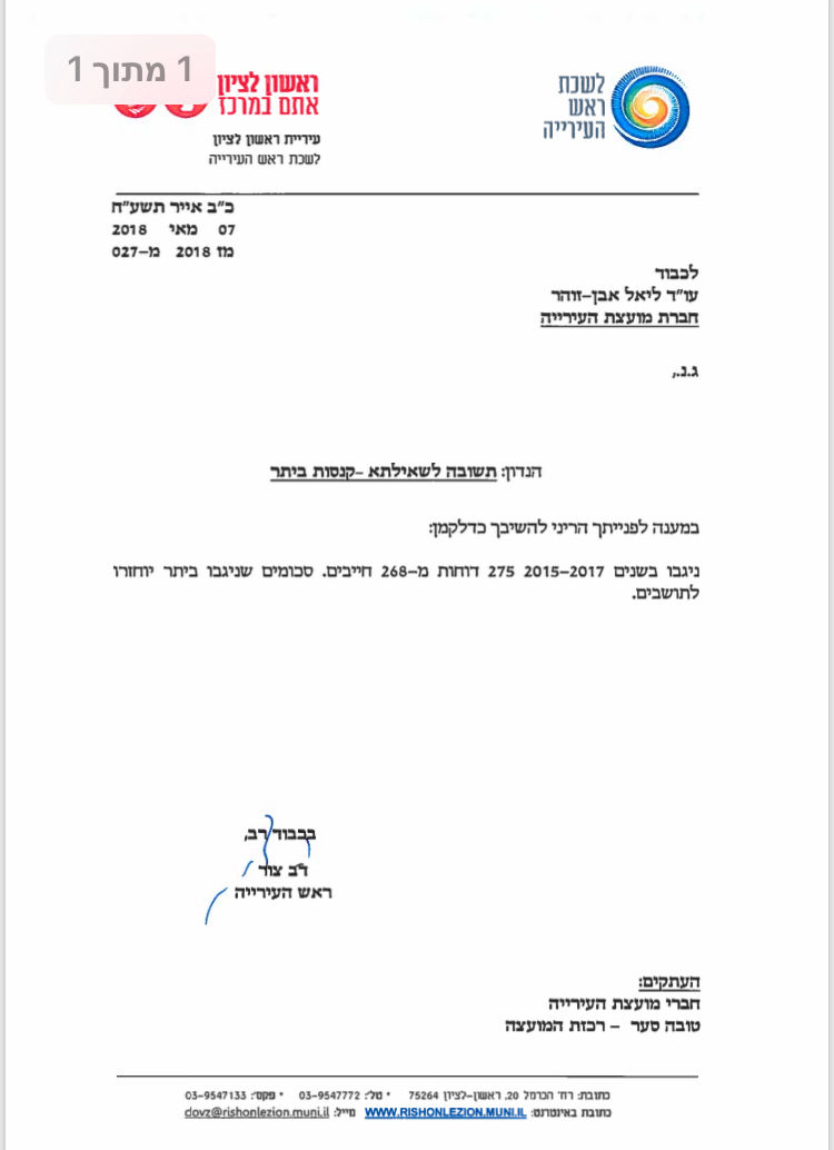 להלן צילום התשובה של ראש העיר לגבי השאילתא