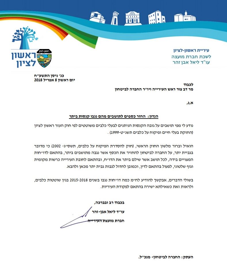 עו"ד ליאל אבן זוהר: ההחלטה להחזיר לבעלי הכלבים כסף על גביית יתר בדו"חות על כלבים משוטטים כתוצאה מפעילותי ומציגה מסמכים לחיזוק טענותיה. ראש העיר דב צור בתגובה "הצחקת אותנו"