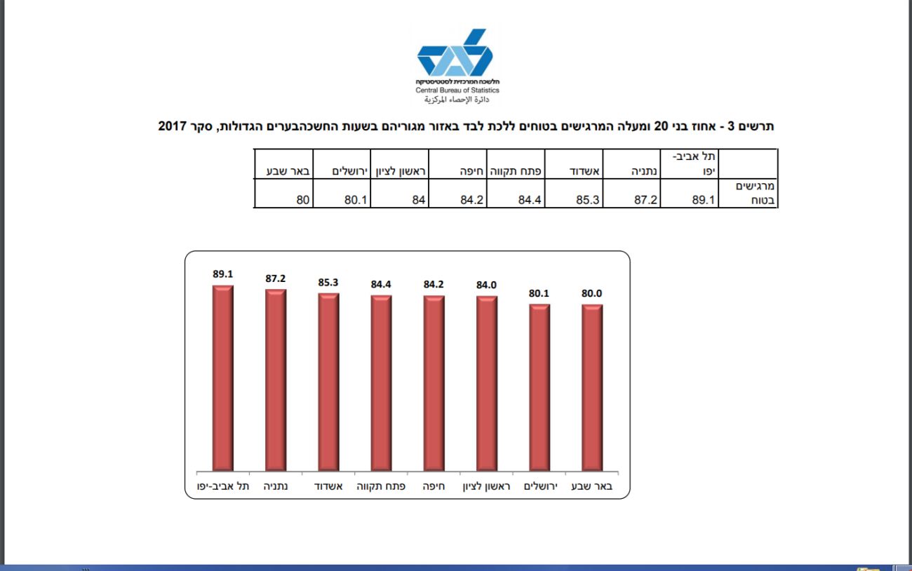3. אחוז בני 20 ומעלה המרגישים בטוחים ללכת לבד באזור מגוריהם בשעות החשכה בערים הגדולות(עד כמה האדם מרגיש בטוח בחשיפה לאיומים בחיי היום יום כמו פגיעה, חשיפה לעבריינות ועוד)