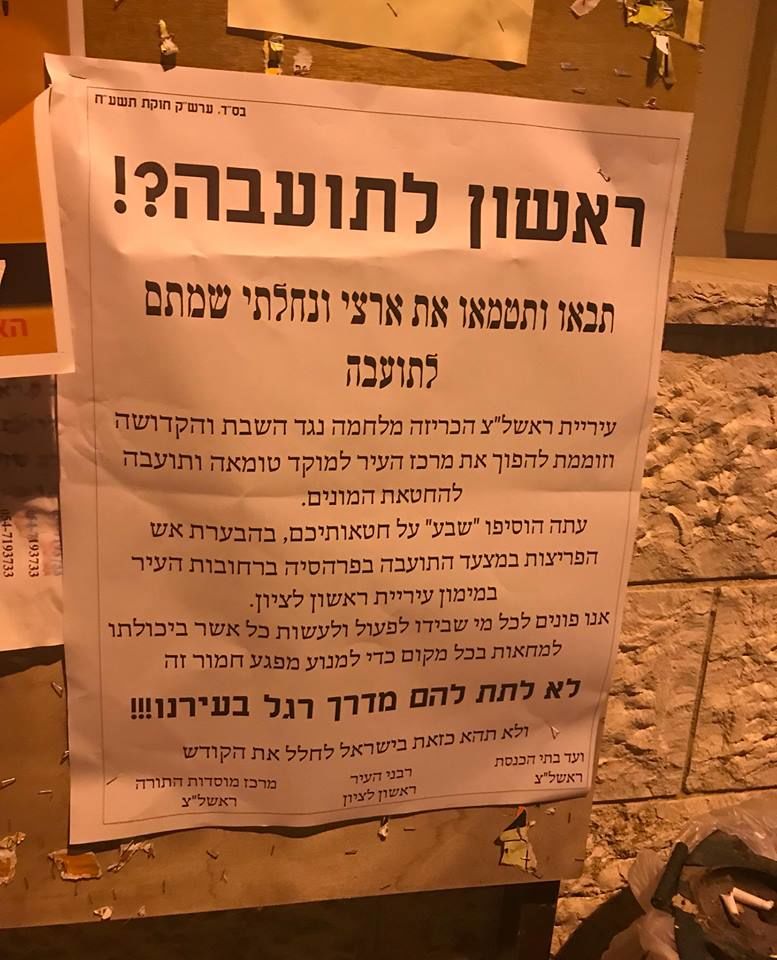 הופצו כרוזים ברחבי ראשון בקריאה לציבור הדתי למחות נגד מצעד הגאווה המתוכנן בראשון לציון