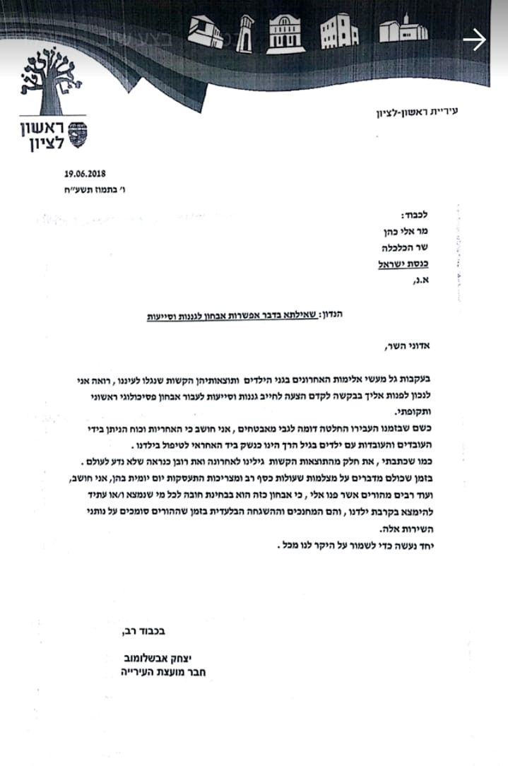 חבר מועצת ראשון לציון, איציק אבשלומוב, פנה לשר הכלכלה לבחינת הצעה לחייב גננות וסייעות לעבור אבחון פסיכולוגי