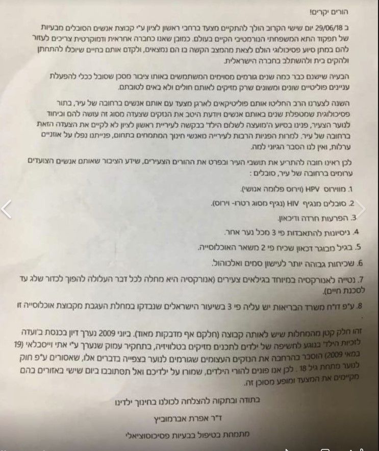 המכתב הופץ ברחבי העיר וגם ברשתות החברתיות ועורר תהיות מיהי אותה ד"ר אפרת אברמוביץ מתמחה בטיפול בבעיות פסיכוסוציאלי החתומה על המכתב? זוהי תעלומה מאחר ובחיפוש באתר משרד הבריאות לא קיים שום רישום של "הרופאה " העלומה ?