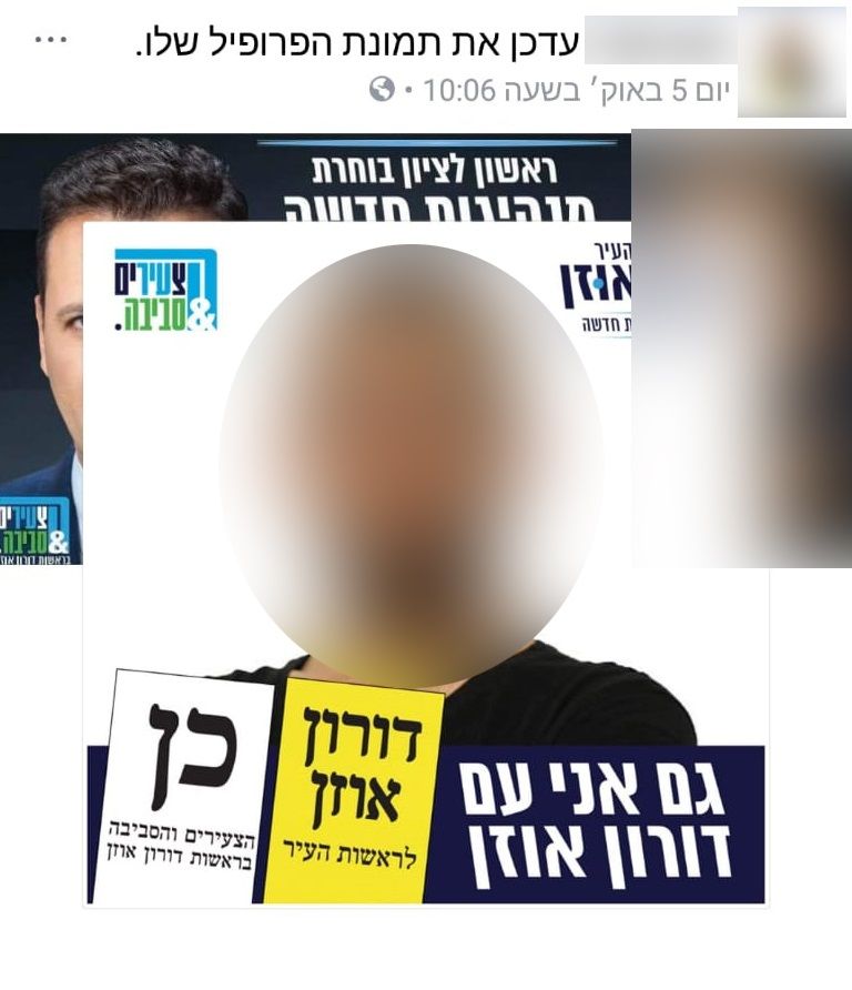 ט.פ קצין צה"ל בדרגת סגן תושב ראשון אשר היה פעיל מאוד אצל דורון אוזן כנער עוד לפני גיוסו לצה"ל לא התאפק ולקראת הבחירות החליף את תמונת הפרופיל שלו בדף הפייסבוק האישי שלו לתמונה במדים כאשר הוא קורא לתמוך בדורון אוזן.