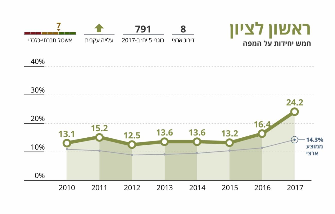 לגבי ראשון לציון עולה כי בשנת 2012 נרשמה ירידה של כ20% בשיעור בוגרי 5 היחידות במתמטיקה בראשון לציון, ובמשך שנתיים לא נרשמה עלייה בשיעור בוגרי 5 היחידות בעיר. מאז שנת 2016 נרשמת בעיר עלייה משמעותית של למעלה מ80% בשיעור בוגרי 5 היחידות במתמטיקה, שמביאה את ראשון לציון לשיא עירוני חדש. ומציב את ראשון במקום ה – 8 בארץ כאשר מספר בוגרי 5 יחידות במתמטיקה בשנת 2017 היה 791 תלמידים כמעט פי 2 מהממוצע הארצי העומד על 14.3% לעומת ראשון 24/2%