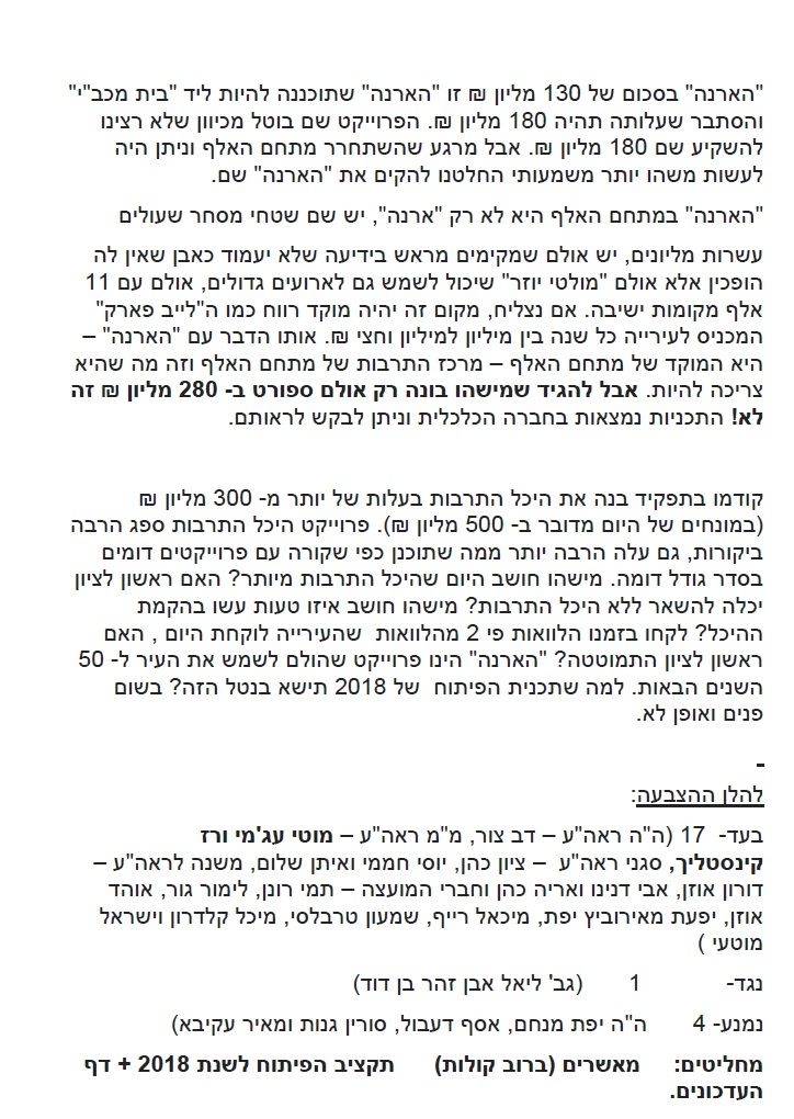 צילום המסך של פרוטוקול מועצת העיר וההצבעה מחודש פברואר 2018 הדן באישור הארנה - הכיתוב במסמך הוא דברי ההסבר של דב צור במועצת העיר