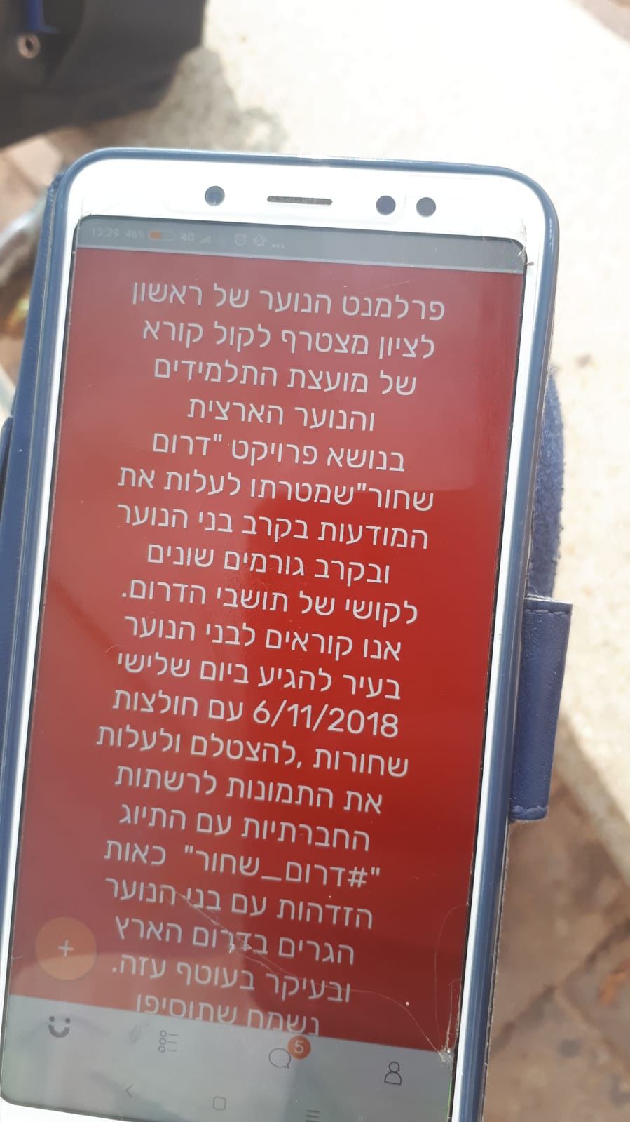 ההודעה הופצה ברשתות החברתיות בעקבות היוזמה ״דרום שחור״ שהגיעה דרך קריאת מועצת התלמידים הארצית לכל בני הנוער בארץ להגיע היום שלישי 6.11 בחולצות שחורות ושלטים "כולנו עם הדרום" על מנת להזדהות עם מצבם של תושבי הדרום.