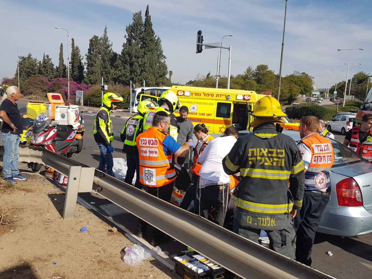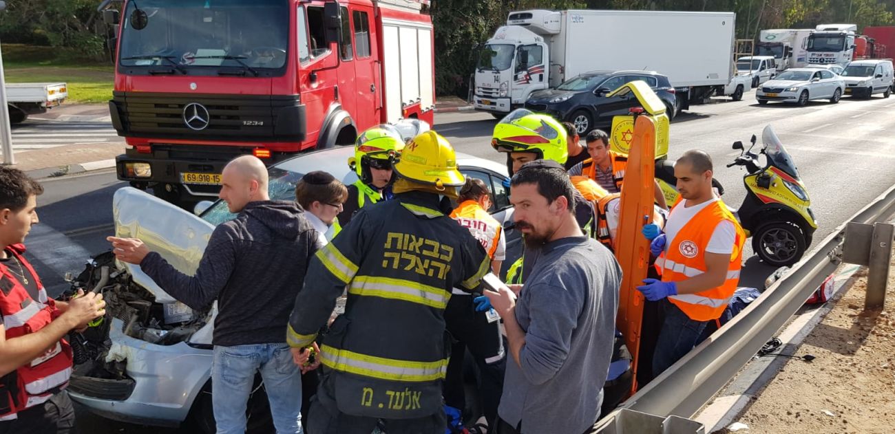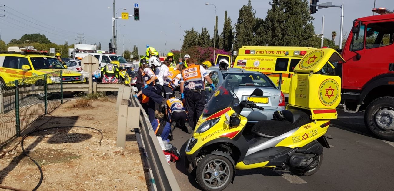 "כשהגענו למקום ראינו שני רכבים מעוכים, מאחד מכלי הרכב חולצה ע"י עוברי אורח שהבחינו בתאונה אשה כבת 72 והשכיבו אותה על הכביש כשהיא מחוסרת הכרה עם פגיעה רב מערכתית, הענקנו לה טיפול רפואי מציל חיים שכלל הרדמה והנשמה ופנינו אותה לבית חולים כשמצבה קשה ויציב , נהג הרכב השני גבר כבן 45 שנחבל בגופו קיבל מאיתנו טיפול רפואי ראשוני ופנינו אותו לבית החולים כשמצבו קל."