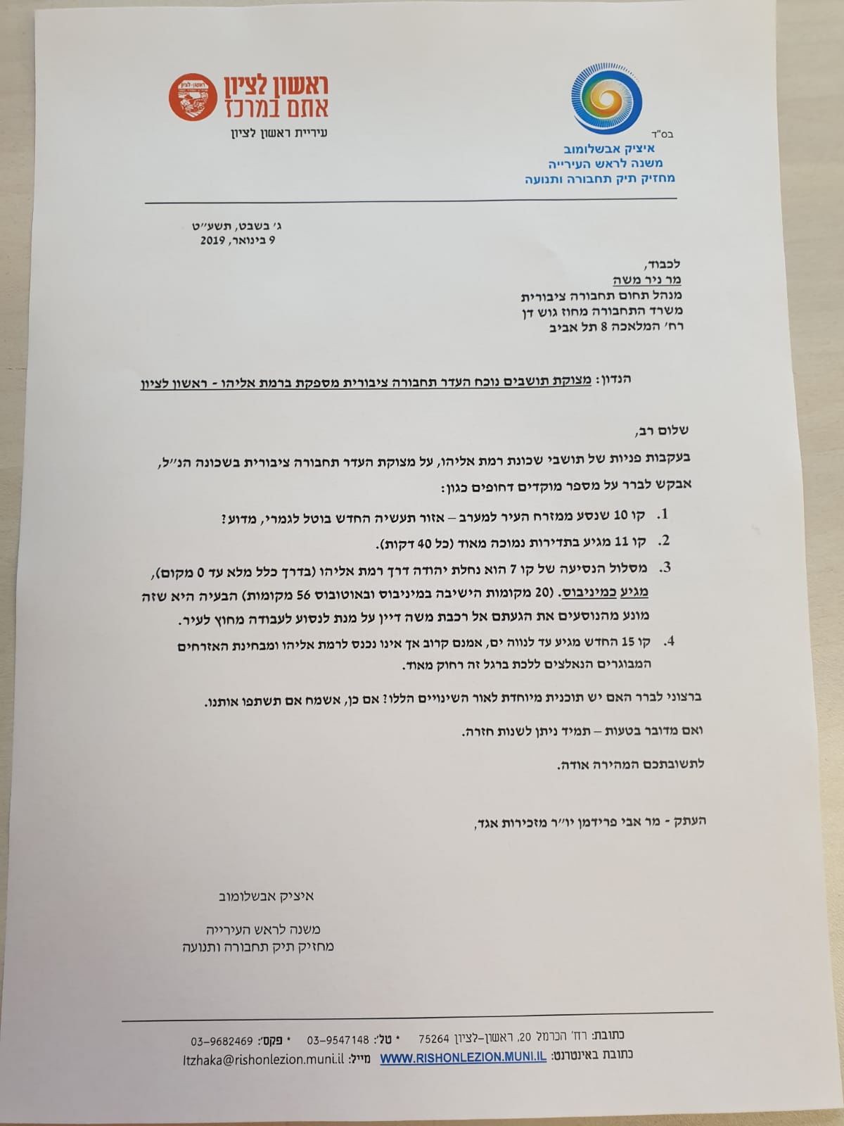 כזכור לפני כחודשיים פתחו תושבי השכונה בעצומה בה הצהירו כי אם לא יתקבל פתרון לנושא ביטול הקו הם יצאו להפגנה. משרד התחבורה הודיע בעקבות כך כי בינואר 2019 יתוגבר קו 11 בשכונה אך לטענתם הדבר לא קרה. הבוקר הוציא חבר המועצה איציק אבשלומוב מכתב למשרדה תחבורה בו הוא מבקש לקבל הסברים על השינויים בקווים בשכונה.