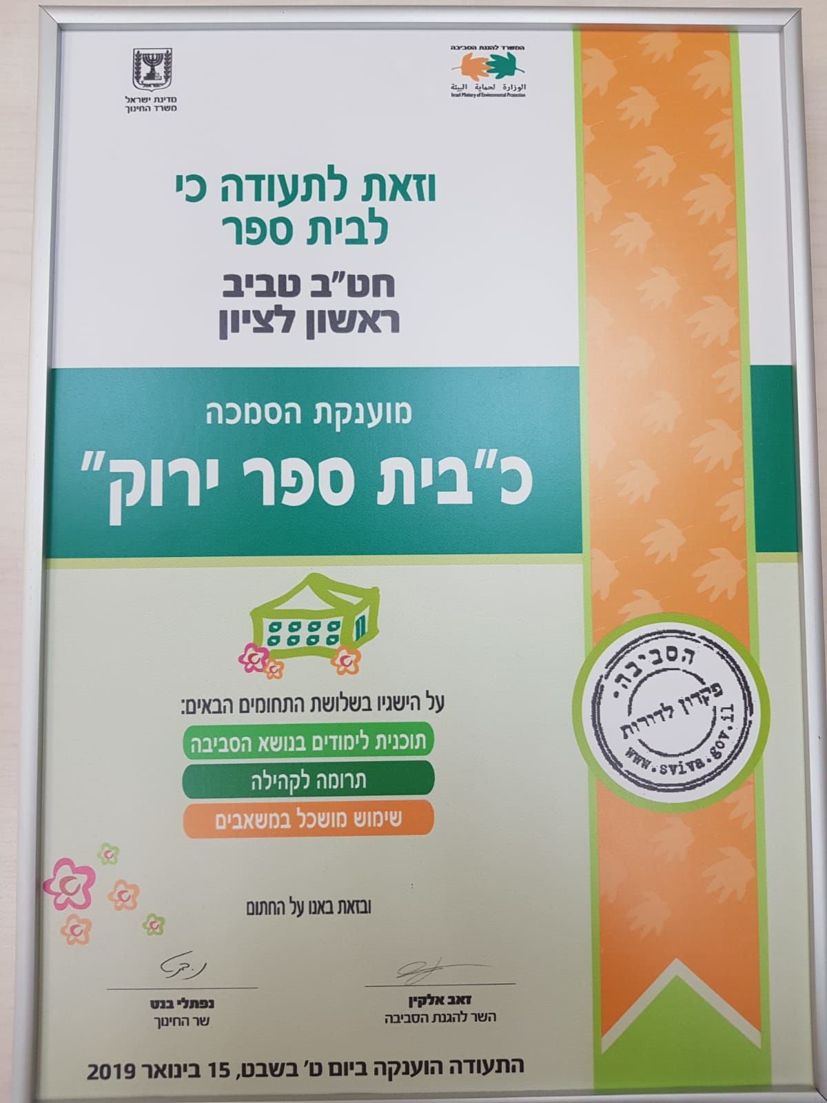 בין בתי הספר שקבלו את התעודה הייתה חט"ב טביב בראשון לציון שקבלה את התעודה על הפעלת מנהיגות ירוקה, פעילויות שונות ומגוונות, ימי שיא בכל שכבות הלימוד ושילוב נושא איכות הסביבה וקיימות בתכניות הלימודים במקצועות השונים: