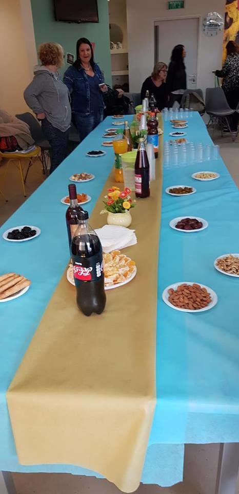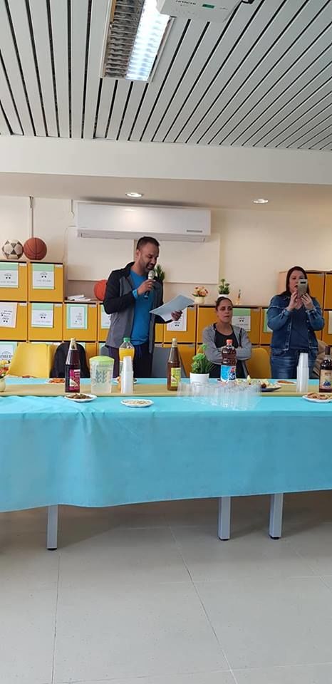 המורים התאספו בחדר המורים עם שולחן ערוך במיטב פירות הארץ