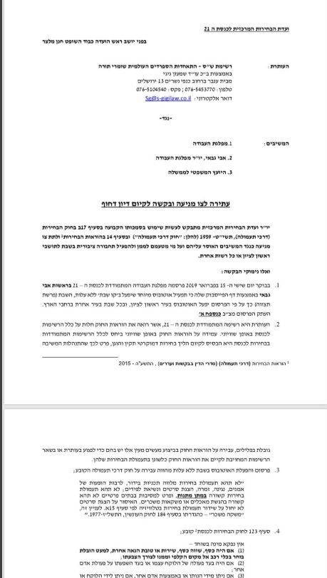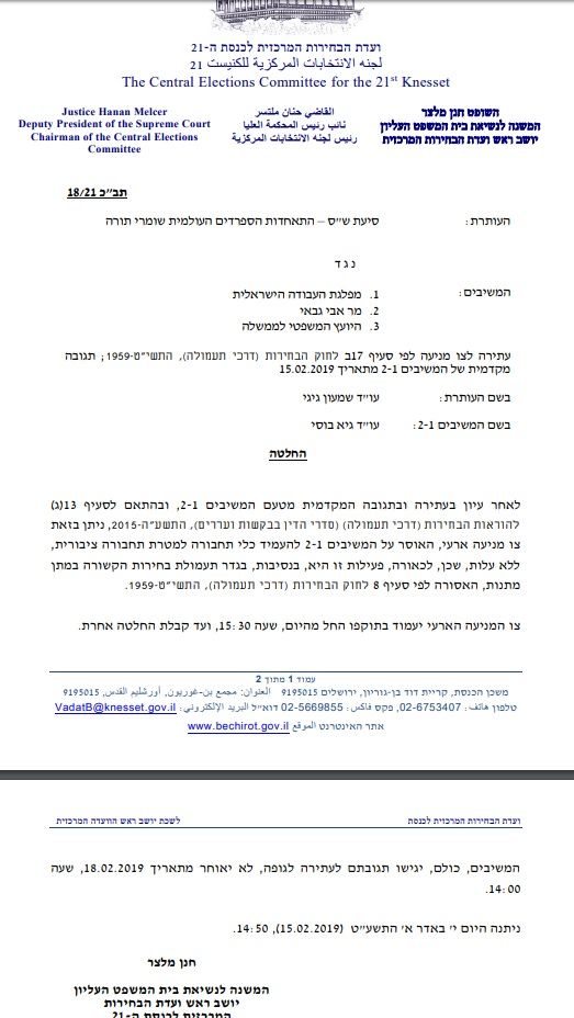 השופט בקש את תגובת מפלגת העבודה עד השעה 14:30 ויש לדעת כי בעתירות מהסוג הזה השופט רשאי לקבל החלטה ללא זימון הצדדים. כך שסביר להניח שתהיה החלטה בשעה הקרובה