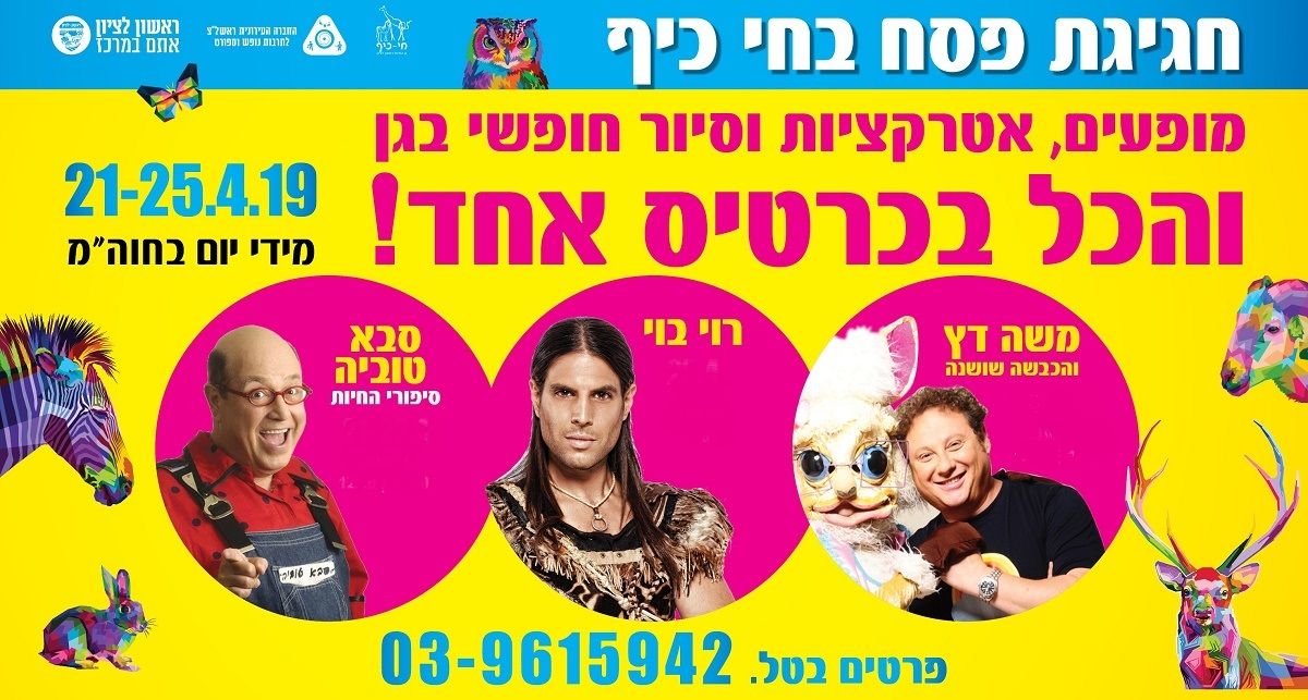 חגיגת פסח בחי כיף ראשון לציון. בחול המועד פסח כוכבי הילדים מגיעים לגן החיות העירוני בשבוע הופעות מיוחד עם משה דץ והכבשה שושנה, סבא טוביה ורוי בוי.