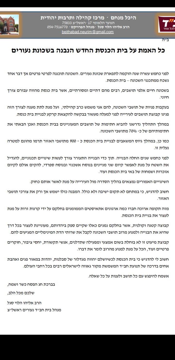 המאבק על בית חב"ד! קריאה לתושבי שכונות נעורים וקדמת ראשון להגיע ביום שני 8/4 למפגש עם ראש העיר ולהביע התנגדות לבניין ולפעילותו. הרב "בית הכנסת הוקם בחתימת 70% מתושבי השכונה ו – 900 תושבים תרמו לבנייתו ובמתחם לא יקום כולל או ישיבה"