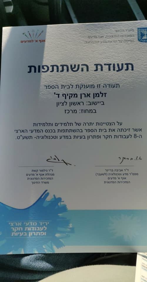 תלמידי חט"ב, זלמן ארן, בראשון לציון קבלו תעודת הצטיינות על עבודתם בכנס החקר הארצי של משרד החינוך