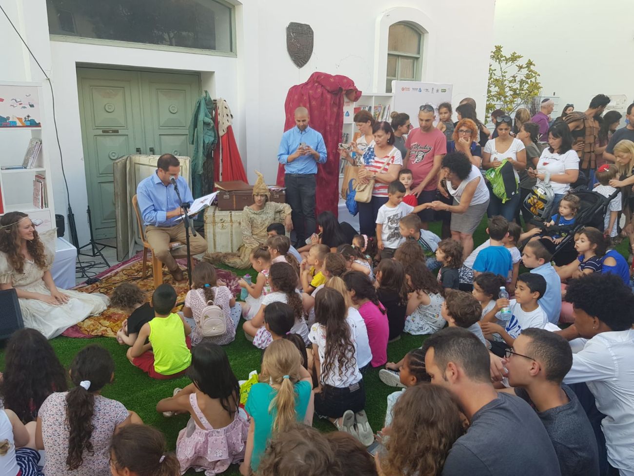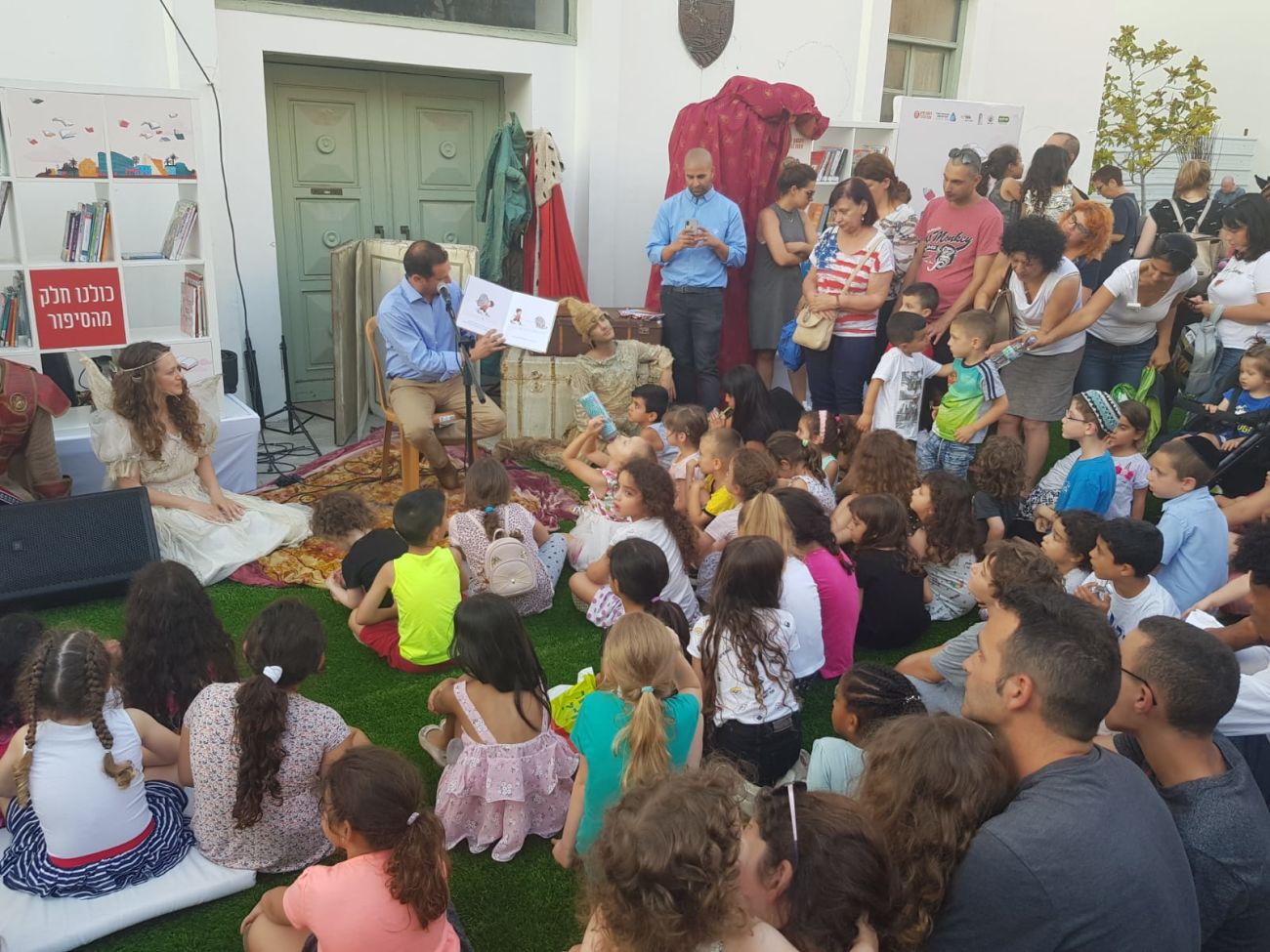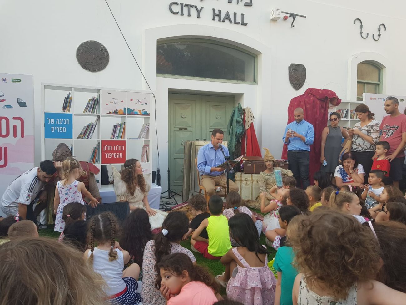 ראש העיר רז קינסטליך התייצב בפתח בניין העירייה הישן והחל להקריא סיפור להנאת הילדים והמבקרים במקום