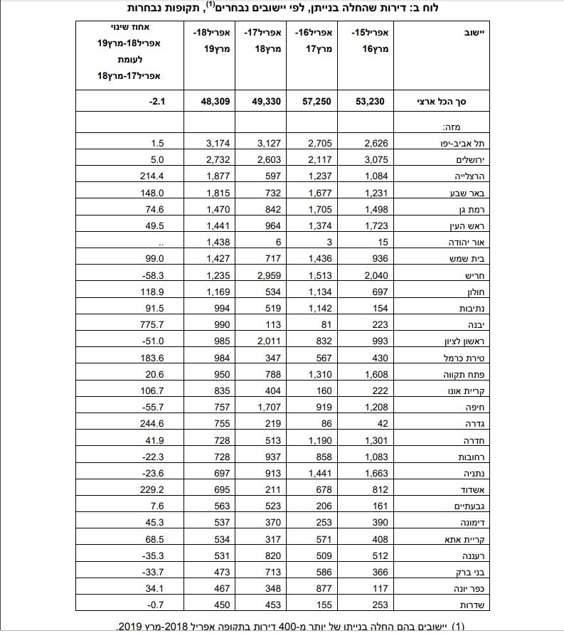 מצורפת טבלת התחלות בנייה ביישובים רחבי הארץ שבהם בונים מעל 400 דירות