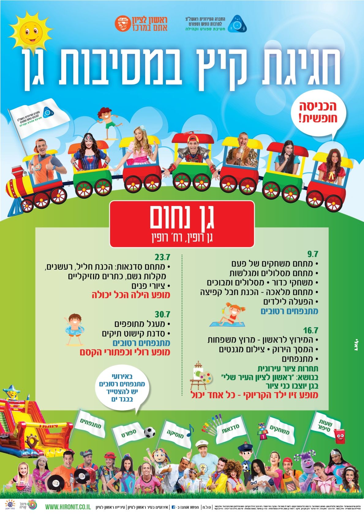 כבכל שנה עיריית ראשון לציון תקיים במהלך חופשת הקיץ את מסיבות הגן שיתקיימו ברחבי שכונות העיר. מסיבות הגן השנה יתקיימו ב19 גנים ופארקים בעיר שם יהנו הילדים משלל סדנאות יצירה, הצגות ילדים, מתנפחים רטובים, סדנאות מדע, תחרויות וכל זה ללא עלות.