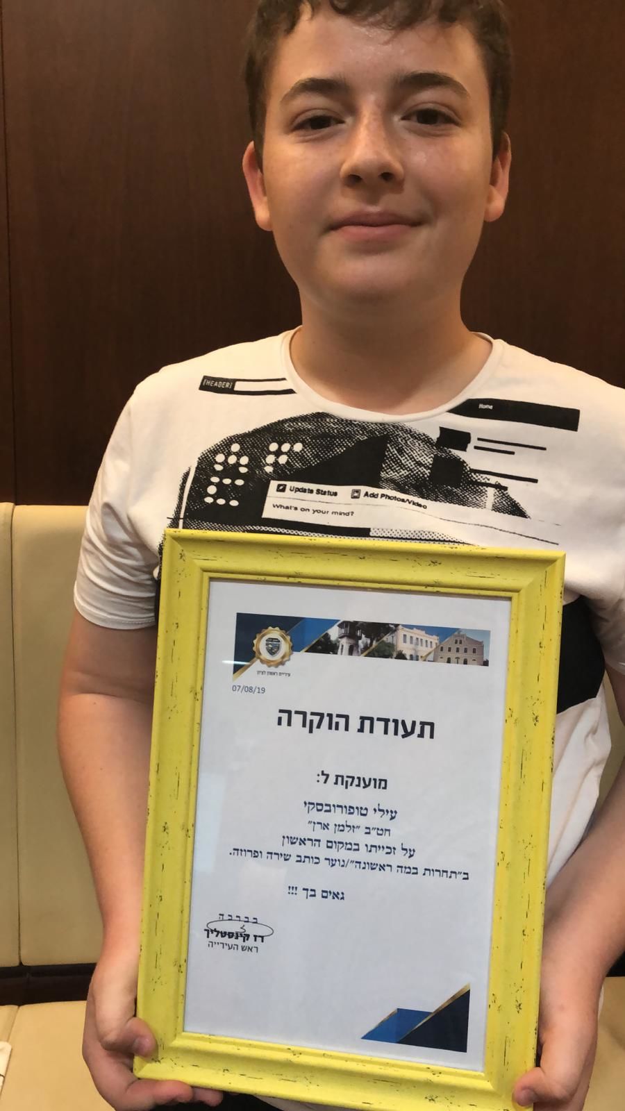 ולעילאי טופורבסקי, תלמיד חטיבת הביניים 'זלמן הרן' שזכה במקום ראשון בתחרות במה ראשונה, תחרות שירה ופרוזה לנוער.