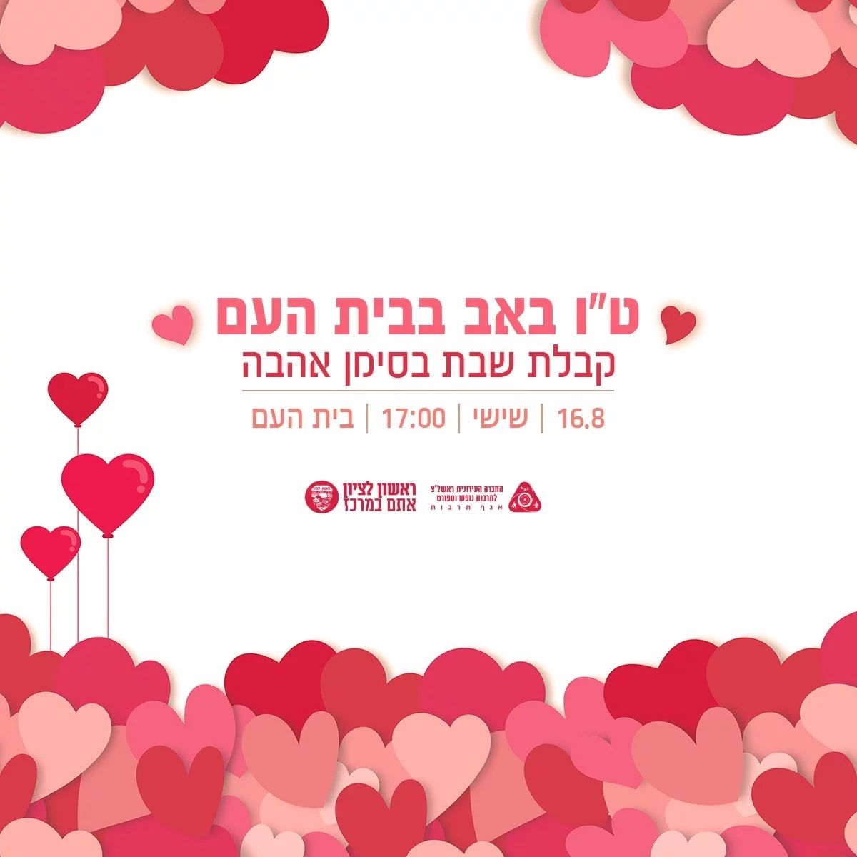 הוועדה הגאה של ראשון לציון, החברה העירונית אגף התרבות ואחוות ישראל גאים מזמינים את התושבים לקבלת שבת חגיגית לכבוד חג האהבה לכל המינים ולכל המגדרים.