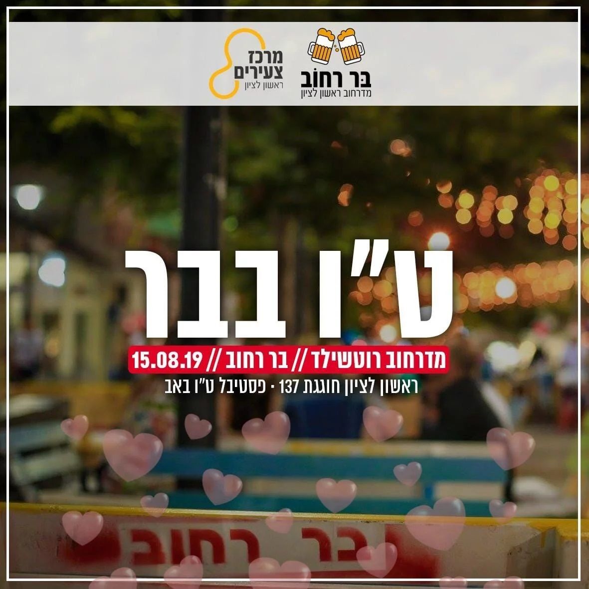 בסיום המופעים מוזמנים התושבים להמשיך ולבלות בחגיגת ט"ו באב בבר רחוב הנמצא במדרחוב רוטשילד.