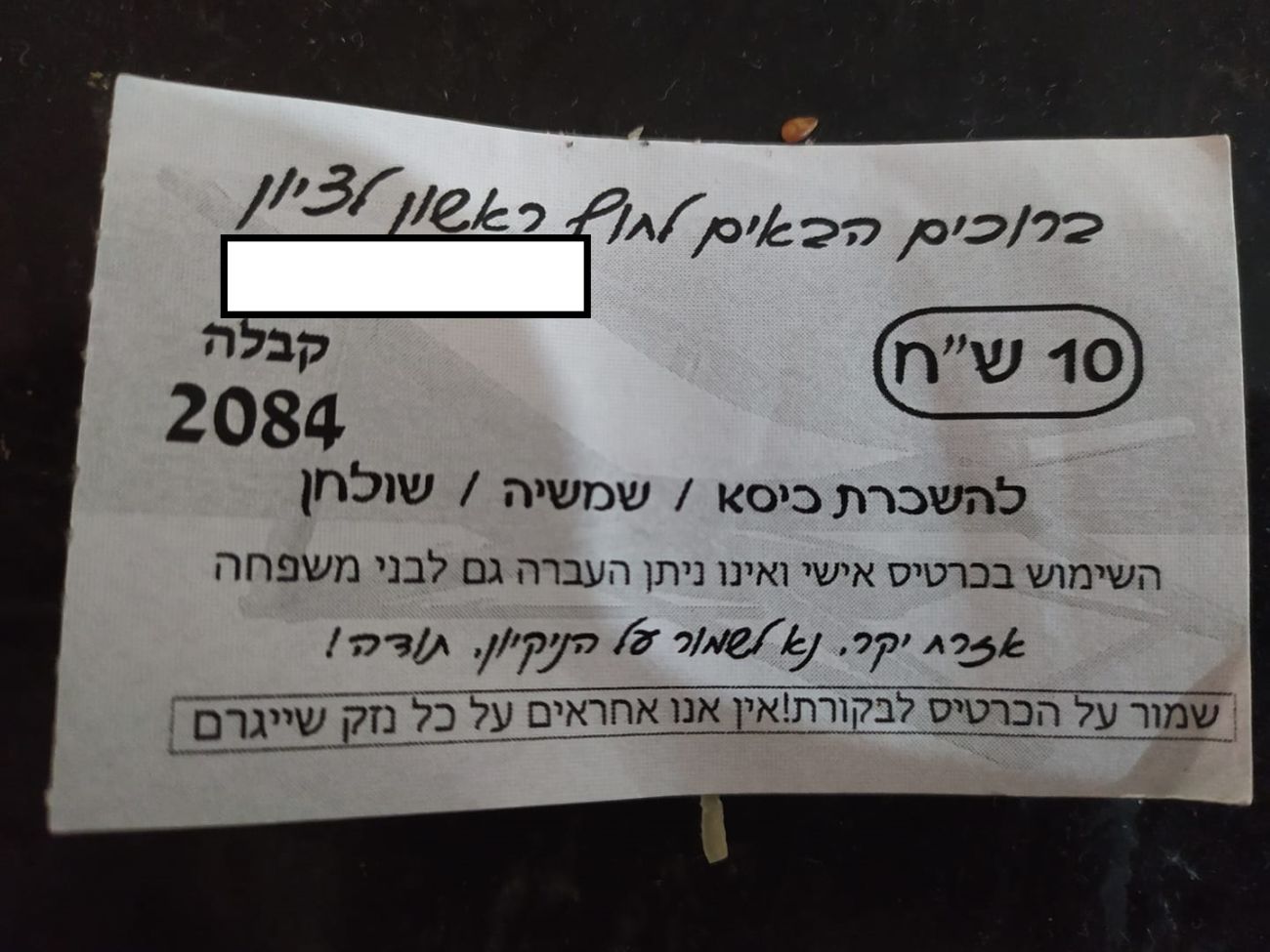ושוב מוצגת הקבלה, ושוב רשום שאפילו לאמא אסור להעביר את הכסא