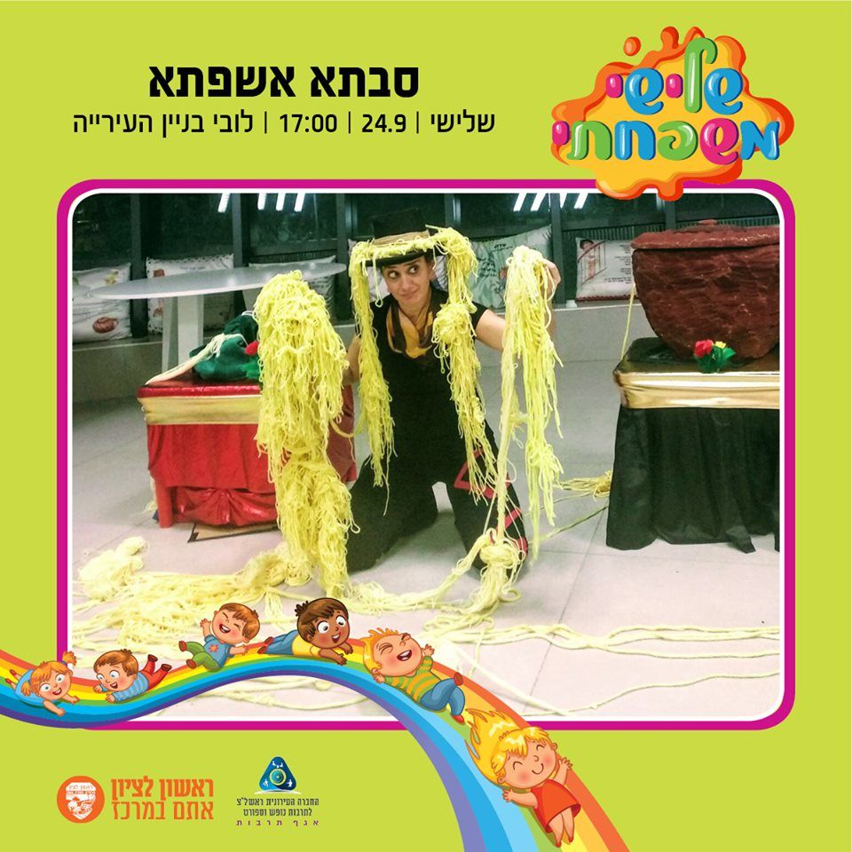לאחר הפסקה קצרה, עיריית ראשון לציון מחזירה את פעילות "שלישי משפחתי" בבניין העירייה. כמידי יום שלישי יחכו לילדים משחקים, הפעלות, סדנאות, פעילויות, הפתעות, הרפתקאות וכמובן הצגת הילדים : "סבתא אשפתא", על קסם מיוחד שמצמיח אטריות.