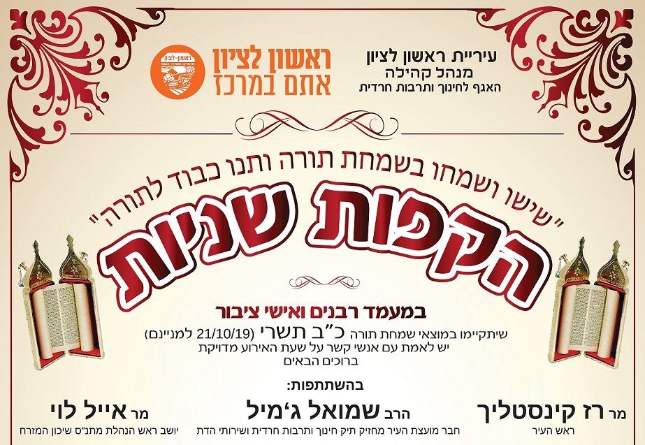 עיריית ראשון לציון ומינהל הקהילה לחינוך ותרבות חרדית מזמינים את תושבי העיר לחגיגות שמחת בית השואבה ושמחת תורה ברחבי העיר. אירועי ההקפות השניות יתקיימו במעמד ראש העיר רז קינסטליך, הרב שמואל ג'מיל, מחזיק תיק חינוך ותרבות חרדית ושירותי הדת , אייל לוי יו"ר הנהלת מתנ"ס שיכון המזרח, רבנים ואנשי ציבור.