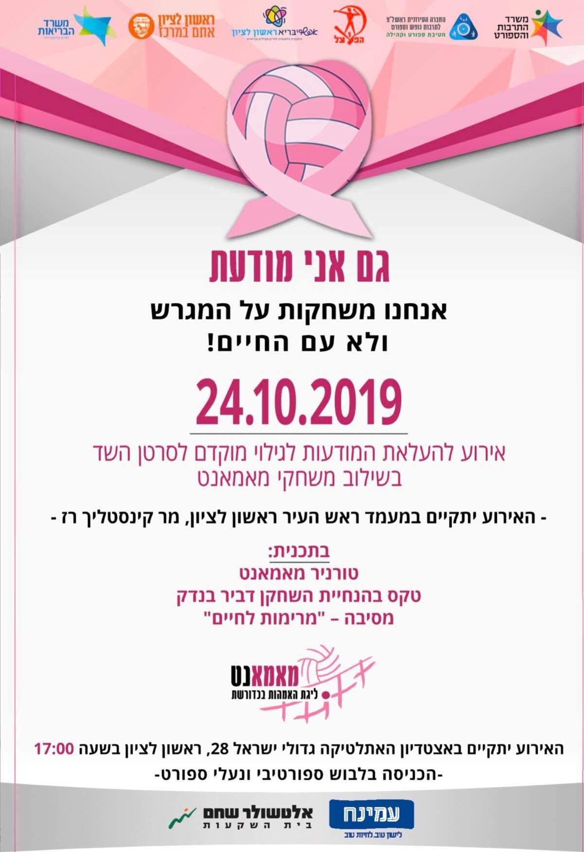 ביום חמישי 24.10 יתקיים באצטדיון האתלטיקה בראשון לציון, הטורניר השנתי של מאמאנט ישראל, להעלאת המודעות לגילוי מוקדם של סרטן השד