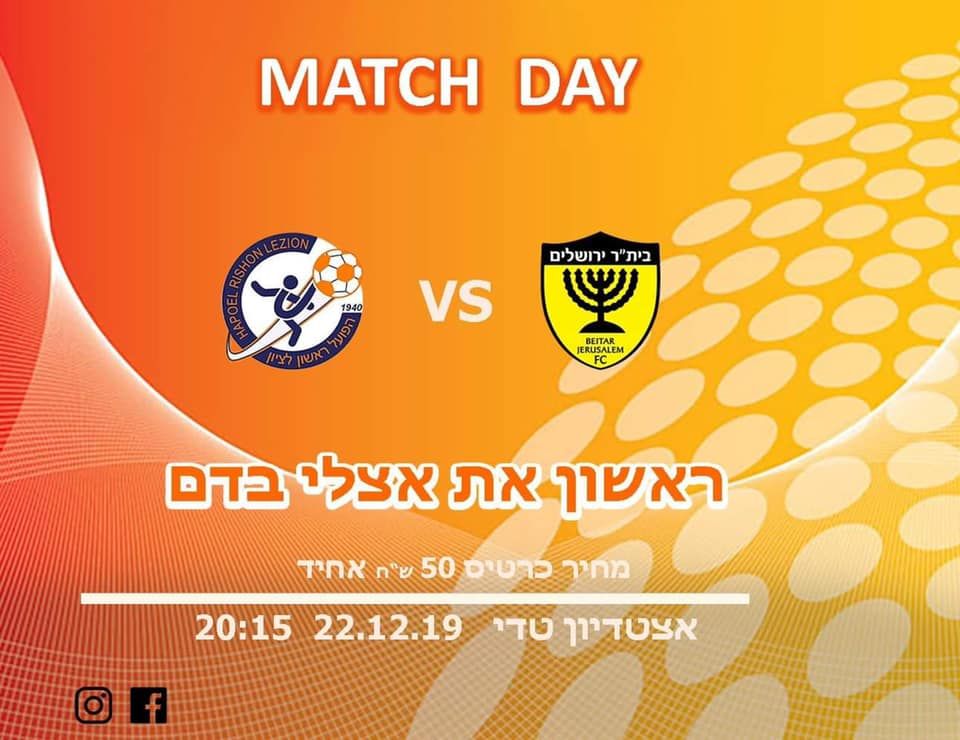 יש לציין כי הערב (ראשון) תתמודד קבוצת הכדורגל הפועל ראשון לציון כנגד בית"ר ירושלים בסיבוב ח של גביע המדינה. המשחק יתקיים באצטדיון טדי.