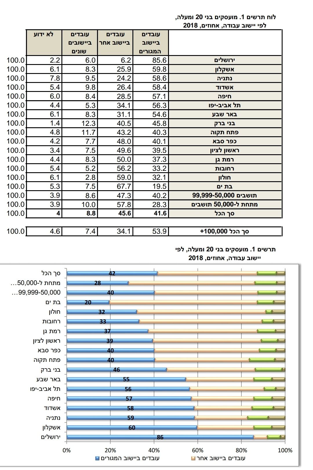 הנתונים מראים כי 42% מהעובדים בישראל עובדים בעיר המגורים שלהם, ובערים הגדולות הנתון מגיע ל54%. מבין הערים הגדולות ירושלים נמצאת במקום הראשון 86% מהתושבים שמתגוררים ועובדים בה.