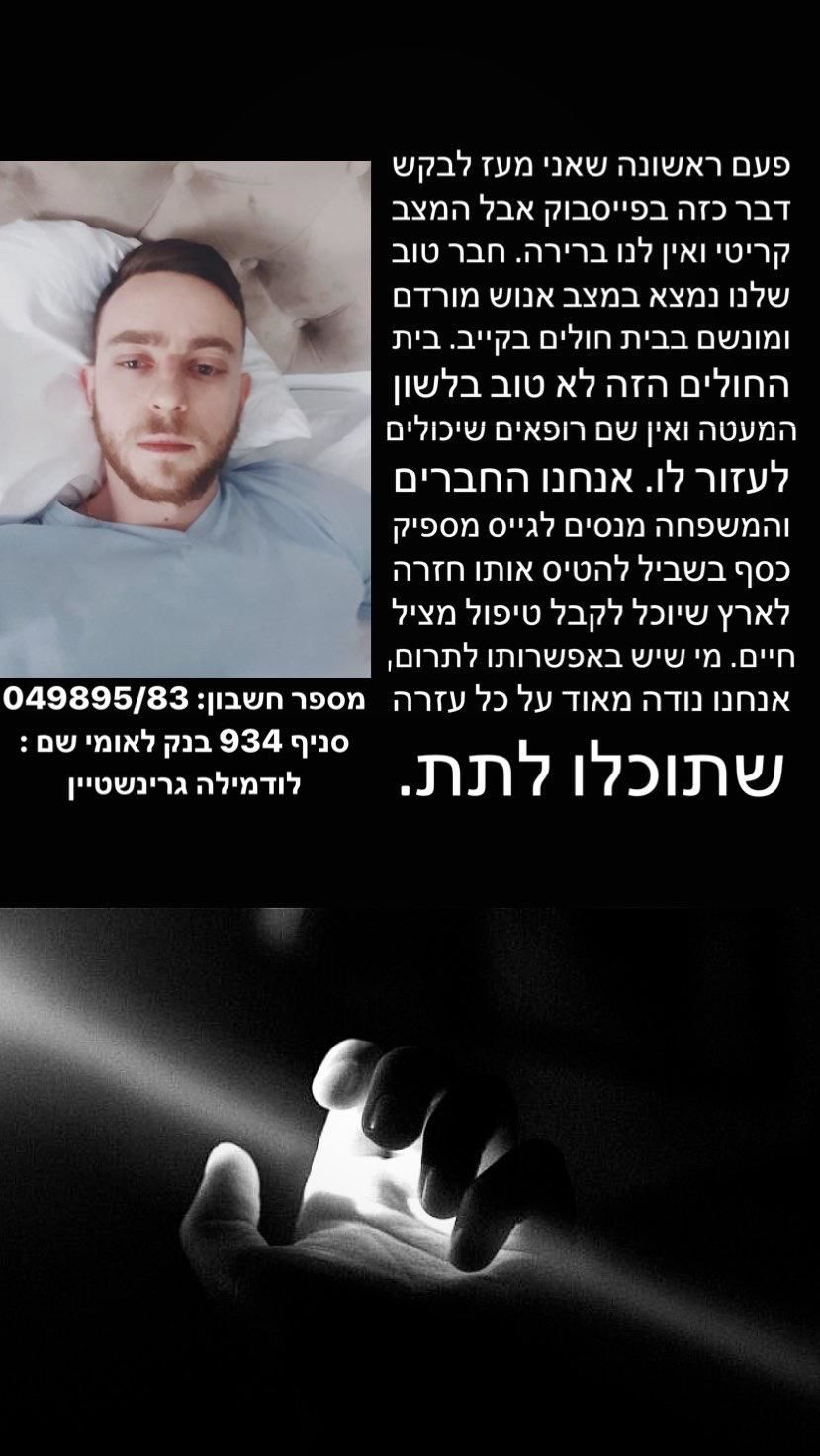 דרמה! צעיר מראשון לציון התמוטט באוקראינה ונאבקים על חייו! לצעיר אין ביטוח בריאות והסיכוי היחידי להציל את חייו הוא להטיסו לישראל. חבריו ומשפחתו החלו בגיוס המונים כדי לממן את הטסתו לישראל