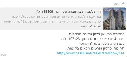 כפי שדיווחנו לפני מספר שבועות על שירות מהפכני של be106 שיווק נדל"ן בתחום קניית/מכירות דירות יד שנייה אשר יושק בקרוב ומאז נרשמו למאגר מעל 450 מחפשי דירות והחל משבוע הבא תושק התוכנה החדשה המחברת בין מוכרי דירות למחפשי דירות באמצעות הוואטסאפ בערים רחובות, ראשון לציון ויבנה.