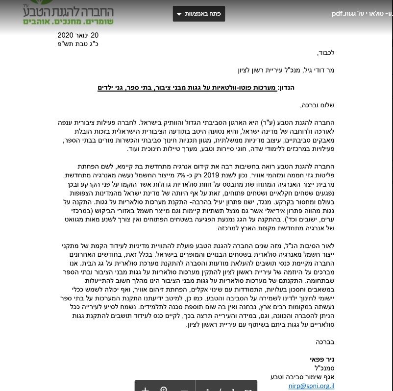 מנגד החברה להגנת הטבע שלחה מכתב תמיכה לעירייה בעד הצבת לוחות סולאריים ואף דורשת להרחיב את ההסברה על חשיבות הלוחות הסולאריים לבתי ספר נוספים, מוסדות ציבור ואף לבתים פרטיים תוך דגש כי אין בהם שום תוספת סכנה לתלמידים