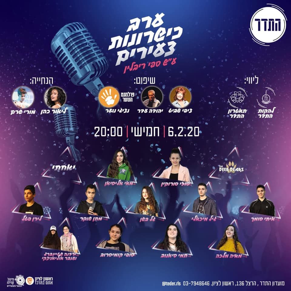 הערב (חמישי 6.2 ) יערך ערב הכישרונות הצעירים של מועדון התדר ראשון לציון שיתן את הבמה לבני הנוער בעיר להראות את כשרונם. התחרות נערכת לזכרו של תושב העיר והבדרן, ספי ריבלין שנותנת את הבמה לבני הנוער בגילאי 13-18 העוסקים באומנות במה כגון : מוזיקה, תיאטרון, ריקוד, סטדנאפ וכו, אומנות פלסטית : ציור פיסול צילום