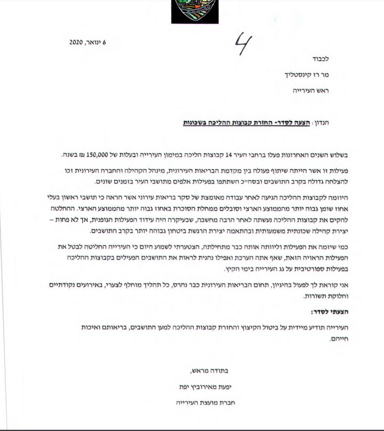 יש לציין כי מועצת העיר תדון בנושא בישיבת המועצה שתתקיים היום (שלישי 11.2) בעקבות הצעה לסדר של חברת המועצה יפעת מאירוביץ יפת שבקשה להחזיר את הפעילות לתושבים.