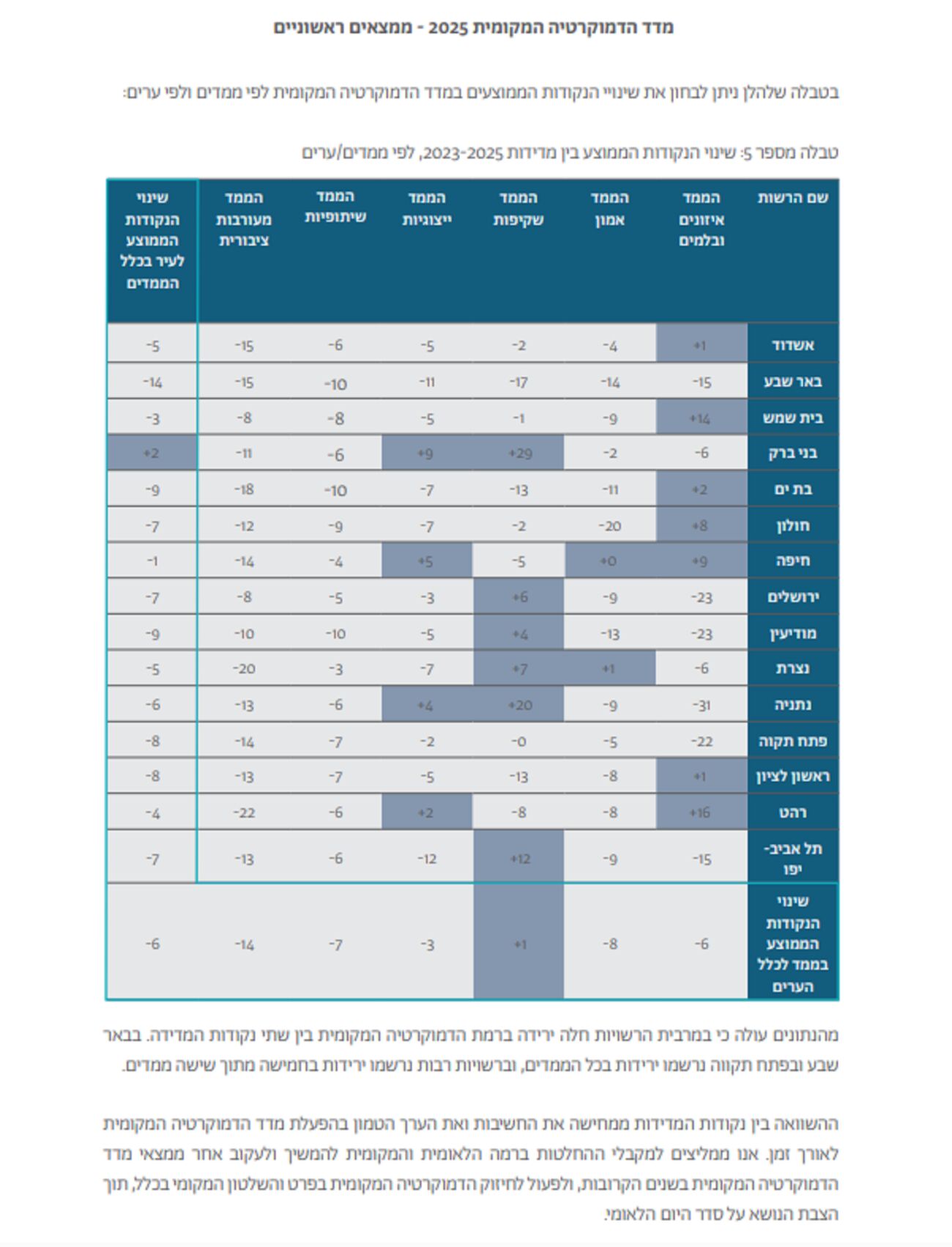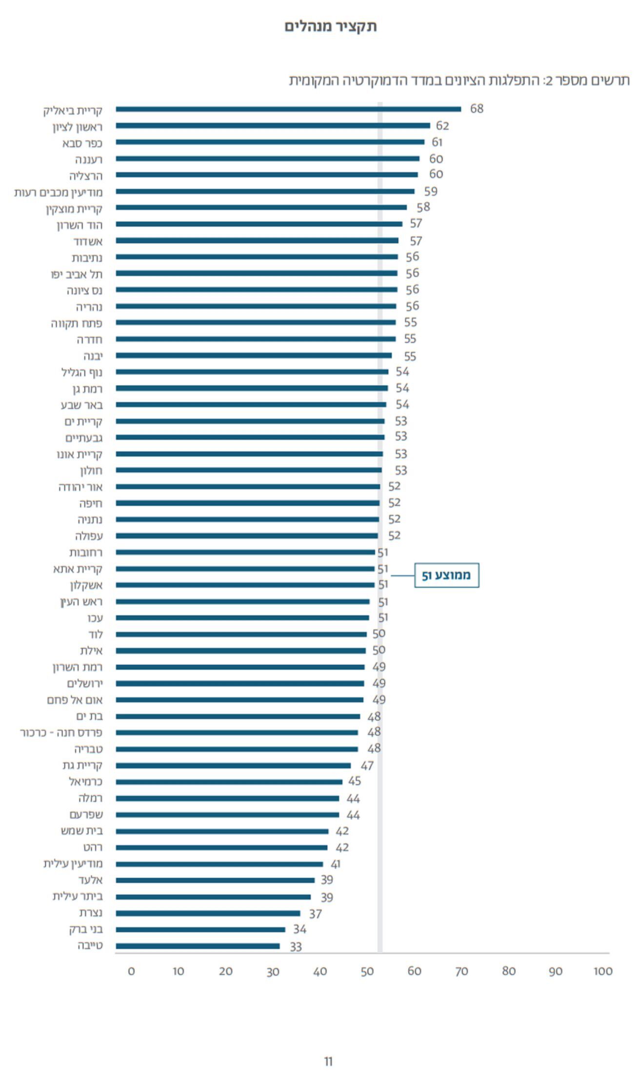מדידת 2025 הקיפה 52 רשויות בישראל (51 עיריות ומועצה מקומית אחת שבהן מתגוררים מעל 40 אלף תושבים) והתבססה בין היתר על סקר נרחב בקרב 20,800 תושבים. הציון הממוצע הארצי של כלל הרשויות עומד על 51, נתון המעיד על פי התנועה כי הדמוקרטיה המקומית בישראל דורשת שיפור מעמיק. ברמה הארצית, הציון הגבוה ביותר ניתן בתחום השקיפות (70), בעוד הציונים הנמוכים ביותר נרשמו במעורבות ציבורית (32) ושיתופיות (28).